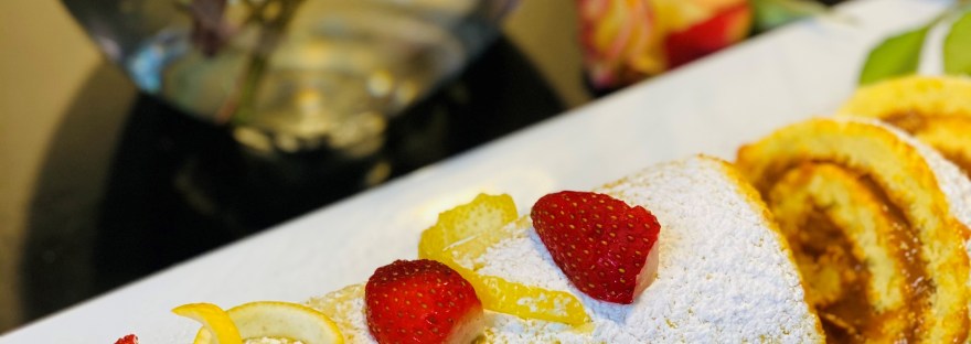 Roll cake with filling once more and plate on your choice of dishware. You can sprinkle some powdered sugar on top and garnish with sliced fruit.